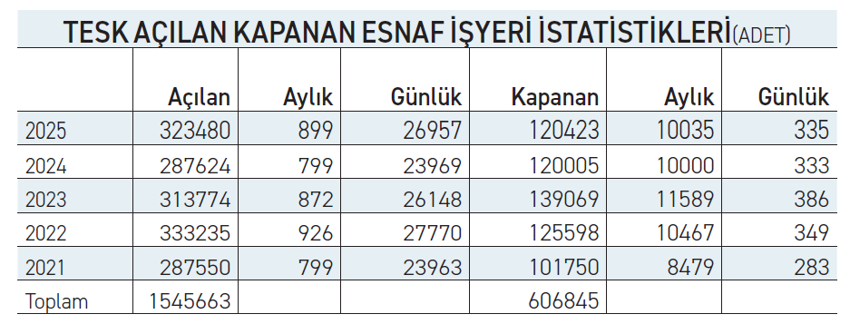 ekonomim.com’da yer alan habere göre, Türkiye Esnaf ve Sanatkarlar Konfederasyonu’nun (TESK) 2025 yılı esnaf iÅŸyeri istatistikleri, ekonomik programın esnaf kesimi üzerindeki etkilerini gösterdi. Geride bıraktığımız 2025 yılında günlük ortalama 899 esnaf iÅŸyeri kurulurken, 335 iÅŸyeri kapandı. Günlük açılan ÅŸirket sayısı son 5 yılın en iyi ikinci seviyesini gördü.
