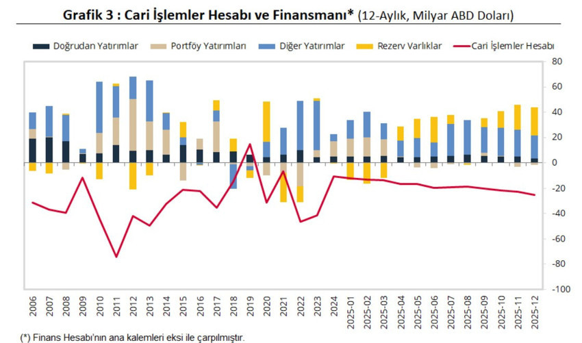 2025 yılı Aralık ayı yıllıklandırılmış cari açığın finansmanına net doğrudan yatırımlar 3,3 milyar ABD doları ve krediler 36,2 milyar ABD doları katkı verirken; net portföy yatırımları 1,7 milyar ABD doları, ticari krediler 2,2 milyar ABD doları ve net efektif ve mevduatlar 15,6 milyar ABD doları negatif yönlü etki etmiştir. Merkez Bankası döviz cinsinden net rezerv azalışı 22,0 milyar ABD doları olmuştur.