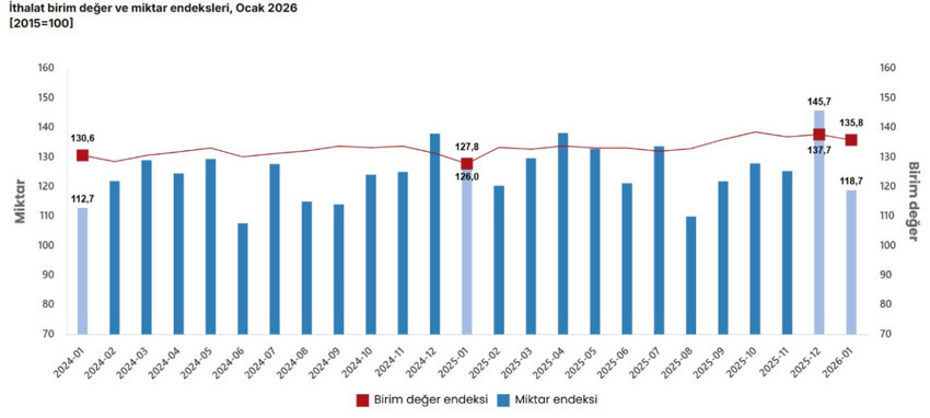 Mevsim ve takvim etkilerinden arındırılmış seriye göre ithalat miktar endeksi; 2026 Aralık ayında 130,6 iken 2026 Ocak ayında yüzde 3,0 oranında azalarak 126,7 oldu. Takvim etkilerinden arındırılmış seriye göre ise ithalat miktar endeksi; 2025 yılı ocak ayında 122,0 iken 2026 yılı ocak ayında yüzde 2,9 oranında azalarak 118,5 oldu.