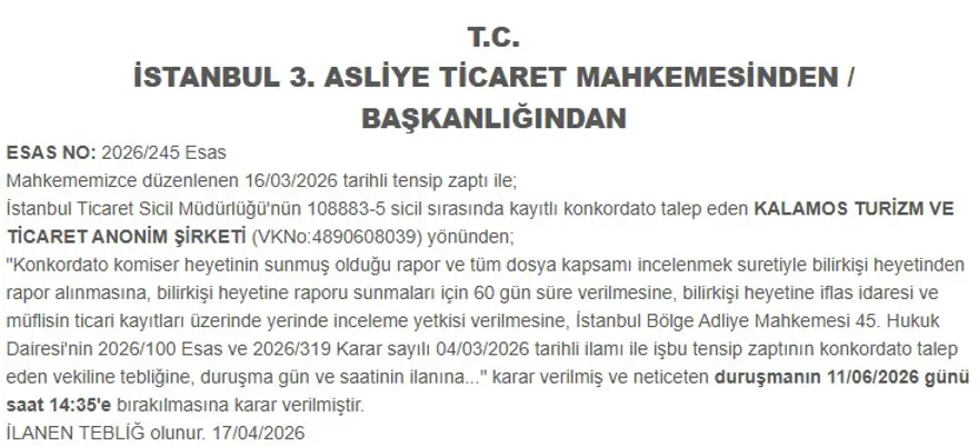 Mahkeme, 16 Mart 2026 tarihinde düzenlenen tensip zaptı ile şirkete ilişkin olarak “Konkordato komiser heyetinin sunmuş olduğu rapor ve tüm dosya kapsamı incelenmek suretiyle bilirkişi heyetinden rapor alınmasına, bilirkişi heyetine raporu sunmaları için 60 gün süre verilmesine, bilirkişi heyetine iflas idaresi ve müflisin ticari kayıtları üzerinde yerinde inceleme yetkisi verilmesine, İstanbul Bölge Adliye Mahkemesi 45. Hukuk Dairesi’nin 2026/100 Esas ve 2026/319 Karar sayılı 04/03/2026 tarihli ilamı ile işbu tensip zaptının konkordato talep eden vekiline tebliğine” karar verdi.