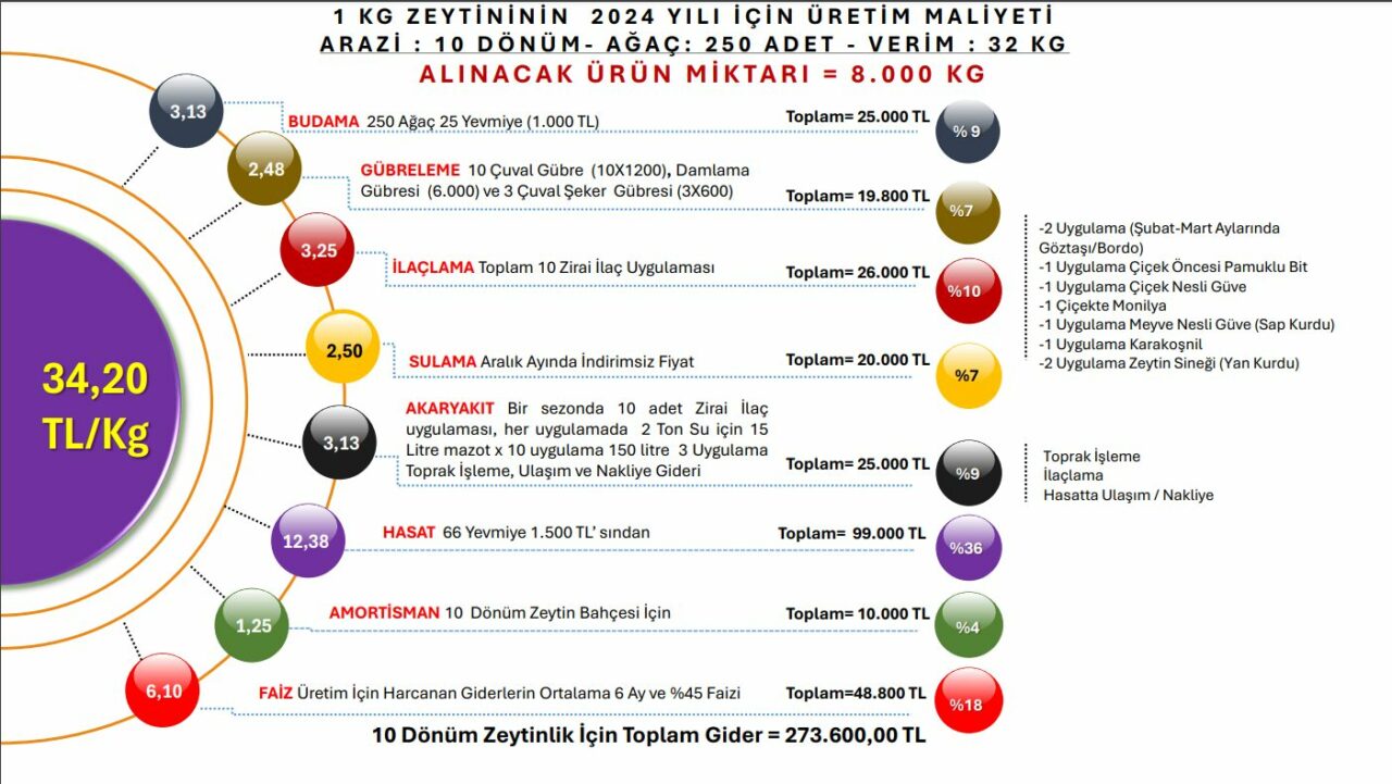 Zeytinde hasat mevsiminin başlamasına sayılı günler kala yoğun bir saha çalışması yapan Marmarabirlik, 1 kilogram zeytinin hasat dönemine kadar üretim maliyetini hesapladı. Yapılan maliyet hesaplamalarında 10 dönüm ve 250 ağaç üzerinden düşünüldüğünde ve değerlendirme yapıldığında; gübreleme bedeli 19 bin 800 TL, budama 25 bin TL, ilaçlama 26 bin TL, sulama 20 bin TL, akaryakıt 25 bin TL, hasat 99 bin TL, amortisman 10 bin TL olarak belirlenirken; masraflar toplamının yüzde 45 üzerinden faiz gideri 48 bin 800 olmak üzere, 1 kg zeytinin ortalama maliyeti toplamda 34,20 TL olarak belirlendi. 10 dönüm zeytinlik için toplam gider ise 273 bin 600 TL oldu.