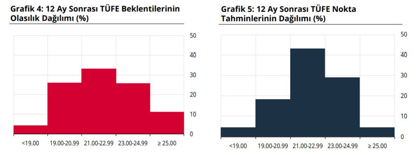 Aynı anket döneminde nokta tahminler esas alınarak yapılan değerlendirmeye göre ise, katılımcıların yüzde 18,46’sının beklentilerinin yüzde 19,00 – 20,99 aralığında, yüzde 43,08’inin beklentilerinin yüzde 21,00 – 22,99 aralığında, yüzde 29,23’ünün beklentilerinin yüzde 23,00 – 24,99 aralığında olduğu gözlendi.