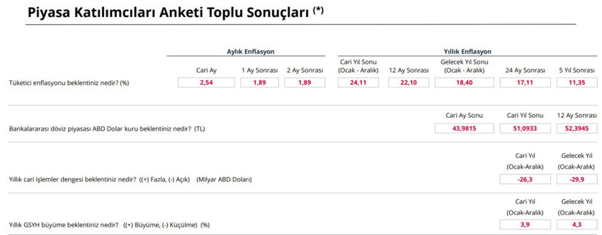 Toplu sonuçlarda 5 yıllık beklentiler dikkat çekti. Piyasa katılımcıları tek hane enflasyonu 5 yıl içinde görmeyi beklemiyor.