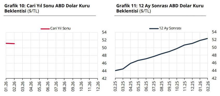 Katılımcıların cari yıl sonu döviz kuru (ABD Doları/TL) beklentisi bir önceki anket döneminde 51,17 TL iken, bu anket döneminde 51,09 TL’ye geriledi. 12 ay sonrası döviz kuru beklentisi ise bir önceki anket döneminde 51,89 TL iken, bu anket döneminde 52,39 TL’ye çıktı.
