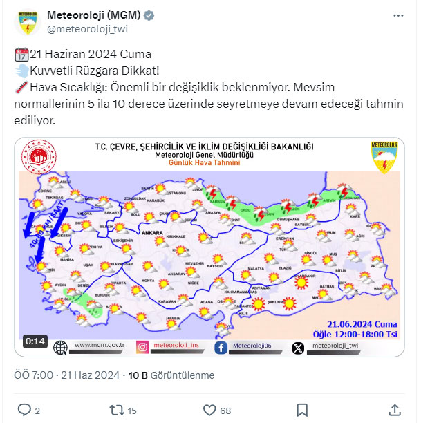 Meteoroloji Genel Müdürlüğü’nün (MGM) verilerine göre, hava sıcaklıkları bugün yurt genelinde mevsim normallerinin 5-10 derece üzerinde seyredecek. Çoğunluğu Güneydoğu Anadolu Bölgesi’ndeki 13 ilde hava sıcaklığı 40 derecenin üstüne çıkacak.