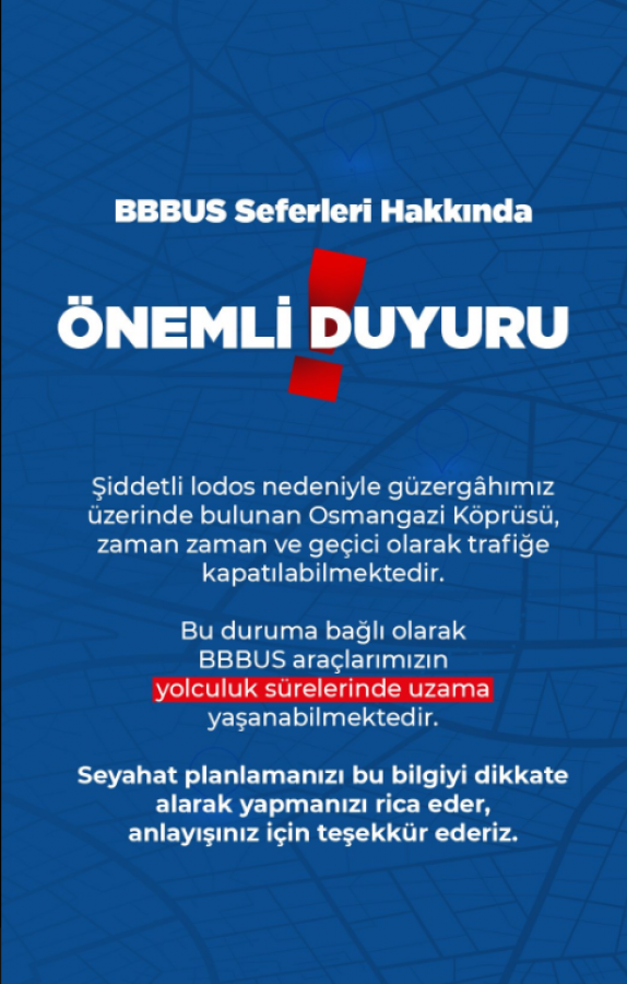 Bu duruma bağlı olarak BBBÜS araçlarımızın yolculuk sürelerinde uzama yaşanabilmektedir.