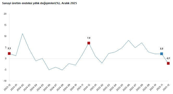 TÜİK’in konuya iliÅŸkin açıklaması şöyle; sanayinin alt sektörleri (2021=100 referans yıllı) incelendiÄŸinde, 2025 yılı Aralık ayında madencilik ve taÅŸ ocakçılığı sektörü endeksi bir önceki yılın aynı ayına göre yüzde 1,9 arttı; imalat sanayi sektörü endeksi yüzde 2,7 azaldı ve elektrik, gaz, buhar ve iklimlendirme üretimi ve dağıtımı sektörü endeksi yüzde 2,4 arttı.