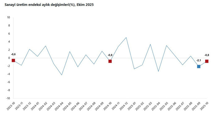 Sanayinin alt sektörleri incelendiğinde, 2025 yılı Ekim ayında madencilik ve taş ocakçılığı sektörü endeksi bir önceki aya göre yüzde 1,2 arttı, imalat sanayi sektörü endeksi yüzde 0,9 azaldı ve elektrik, gaz, buhar ve iklimlendirme üretimi ve dağıtımı sektörü endeksi yüzde 1,2 azaldı.